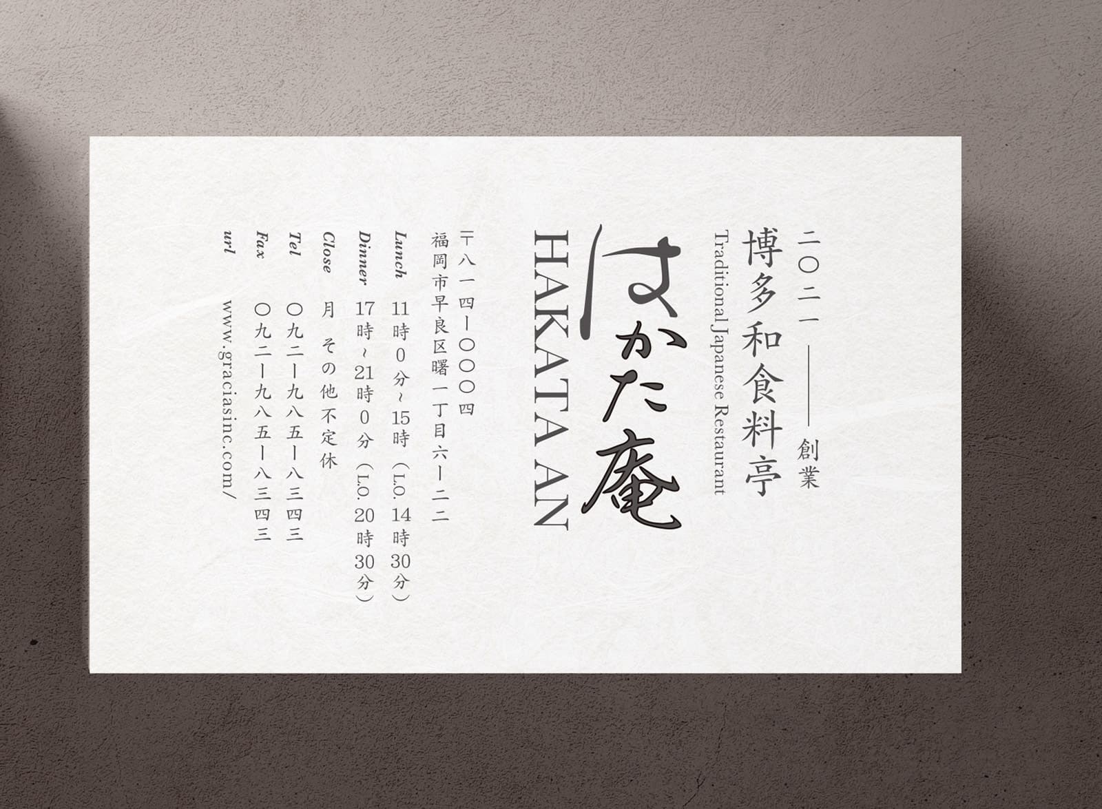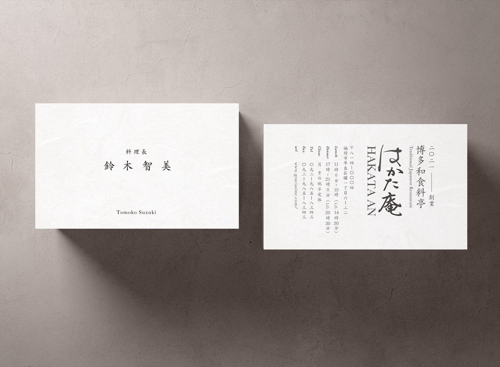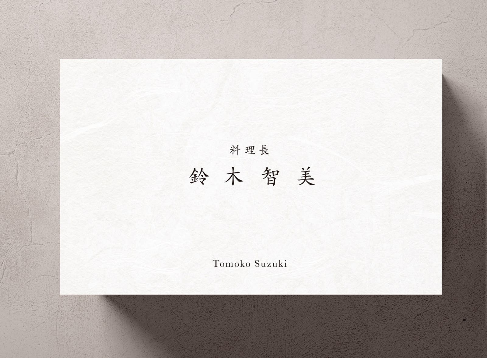 両面大礼紙や新バフン紙などの特徴的な用紙の質感を活かすシンプルなレイアウトデザインです。裏面はデザイン性のある文字要素で上品にまとめています。